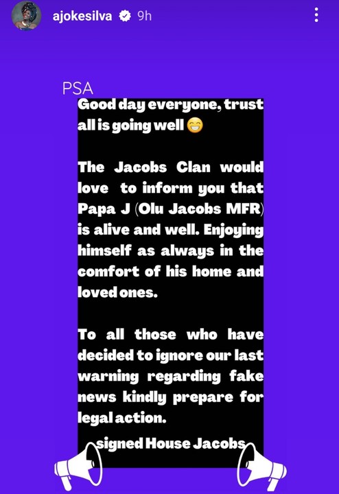 She said on a open post tell them prepare for legal Action. My husband Olu Jacob is alive.
