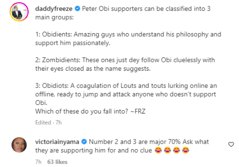 Daddy Freeze had taken to his IG page on Wednesday, August 31, 2022, where he categorised Peter Obi supporters can be classified into 3 main groups: