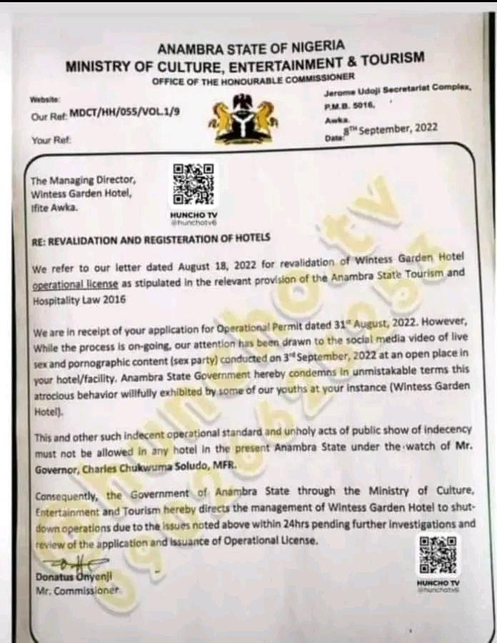 The Anambra State Government has suspended operations in a section of Wintess Garden Annexe, Ifite Awka, over a viral pool sex video which was linked to the facility.
