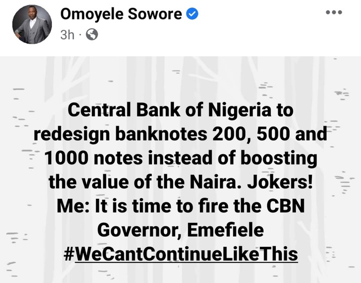 Sack Emefiele Now - Sowore Reacts To Redesigning Of Naira Notes