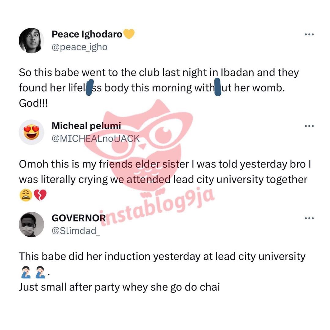 A young nurse, identified as Omoniyi Boluwatife, has been found d£ad with her womb r#pped off in Ibadan, Oyo State